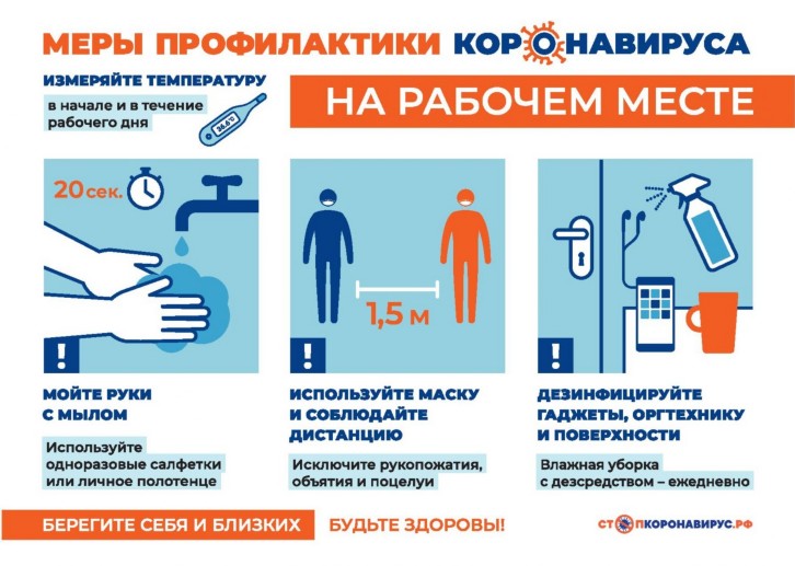 · На работе регулярно очищайте поверхности и устройства, к которым вы прикасаетесь (клавиатура компьютера, панели оргтехники общего использования, экран смартфона, пульты, дверные ручки и поручни).